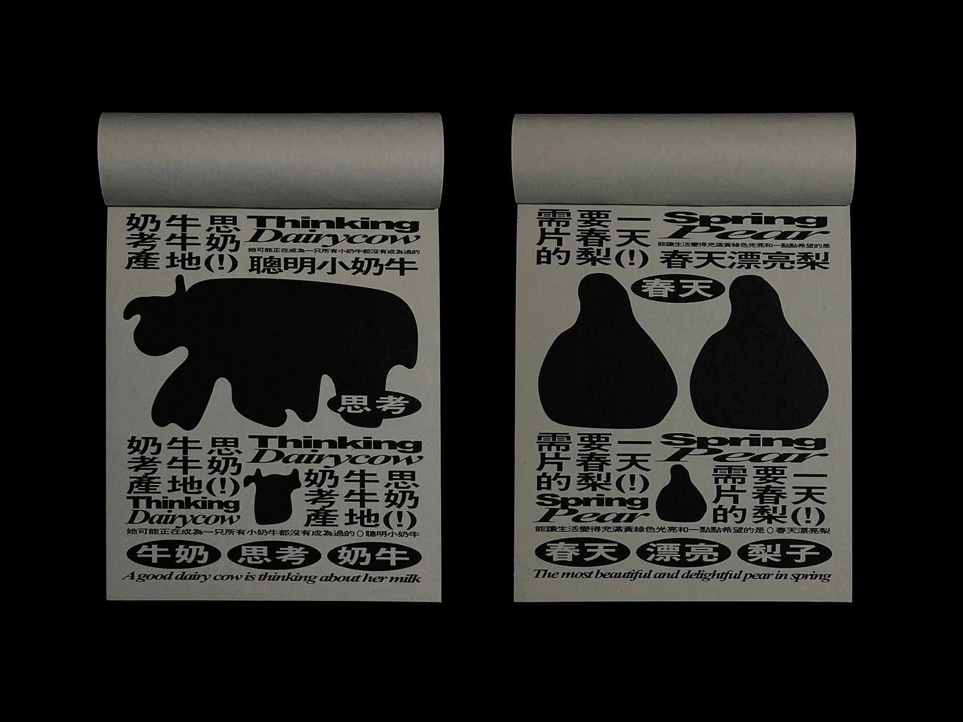 “只有在搬家的时候才会发现平时不足为道的事物能占据那么大的空间,就像在只有炒肉的时候才会发现厨台上少了一个甜辣椒。”充满甜辣椒的夏天是一份对日常生活中常被忽视却又珍贵无比的事物的一份画像,看似荒诞的词语组成的文字排列与抽象的图形组合在一起,在充满了符号化的作用的同时也形成了街头广告般“类波普”的视觉效果。这一系列被忽视的事物实则是现实生活中一系列人与事的暗喻,试图用不那么沉重又有些许当代中国特色的方式使人思考阴暗面所存在的事物的可能性与丰富性。印刷选择粗糙质感的新闻纸与荧光单色孔版印刷(Risograph)油墨,使得这一系列画像从设计本身到现实载体都具有一种”粗糙且珍贵“的特性。
